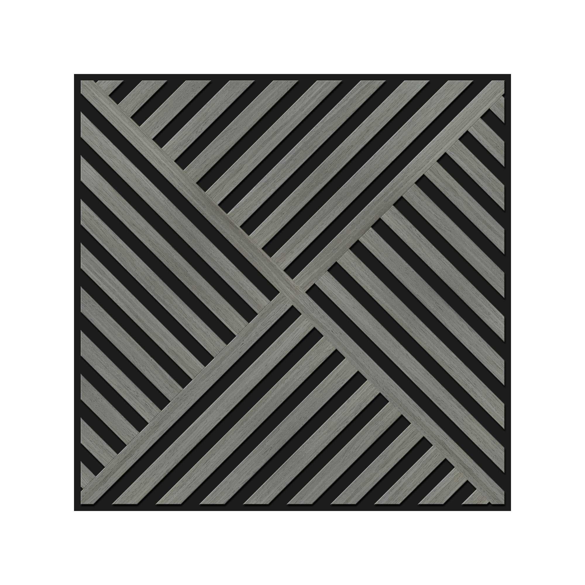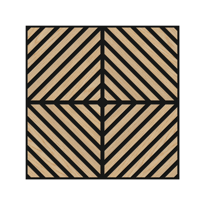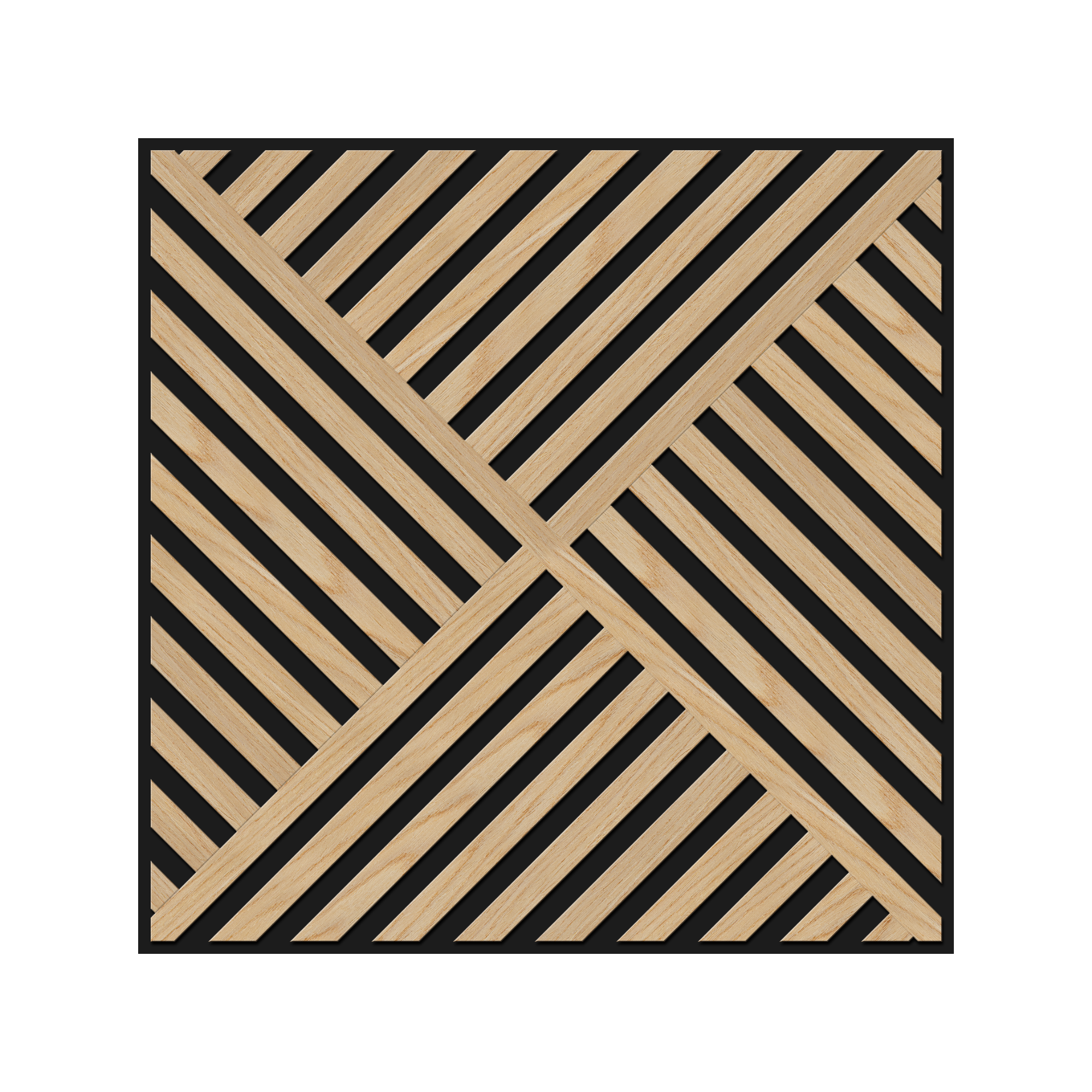 Palillería acústica con diseño de listones cruzados en roble natural. Panel fonoabsorbente que combina estética geométrica y confort sonoro.