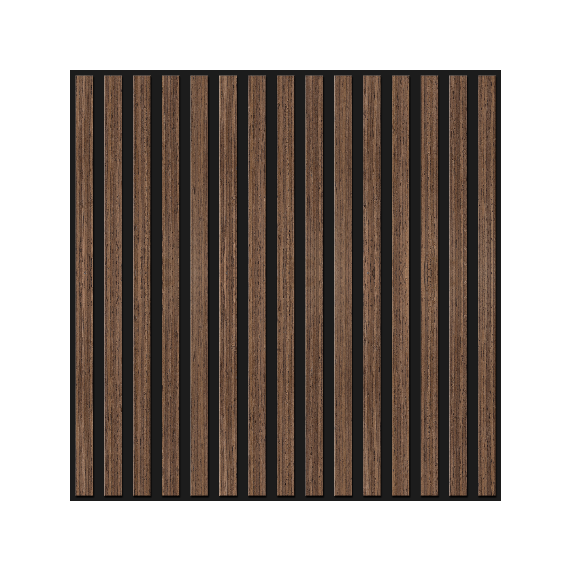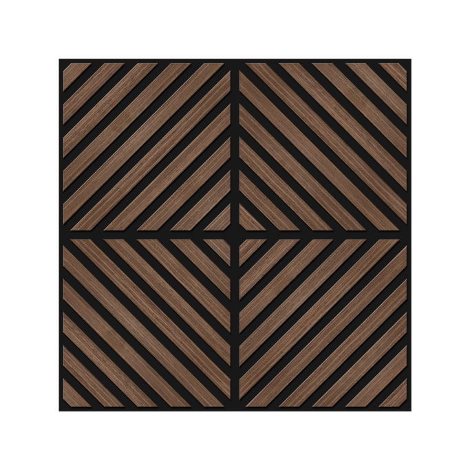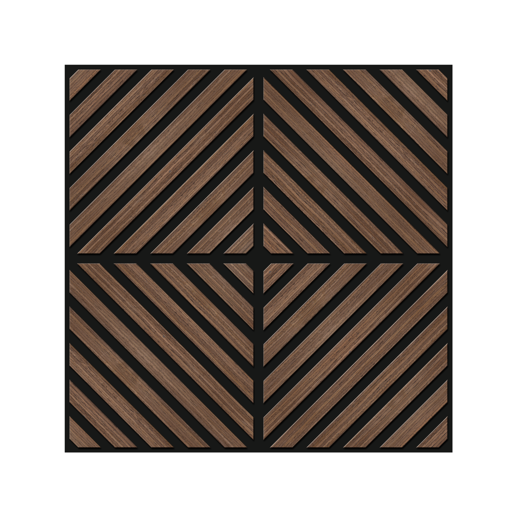 Palillería acústica con patrón geométrico en nogal oscuro sobre fondo negro. Diseño de alta gama con propiedades de absorción de sonido.