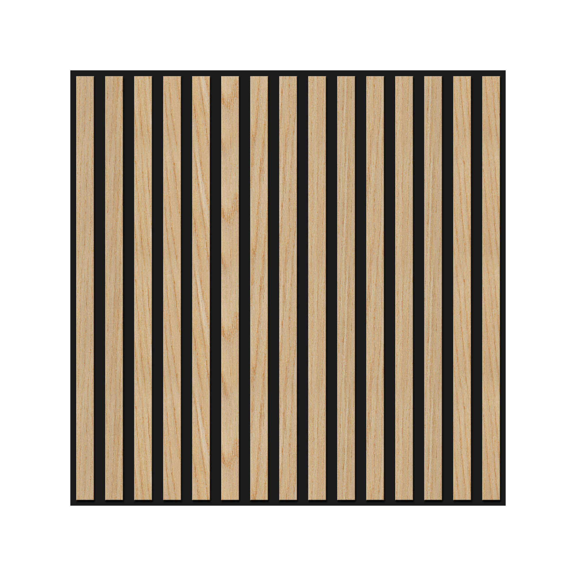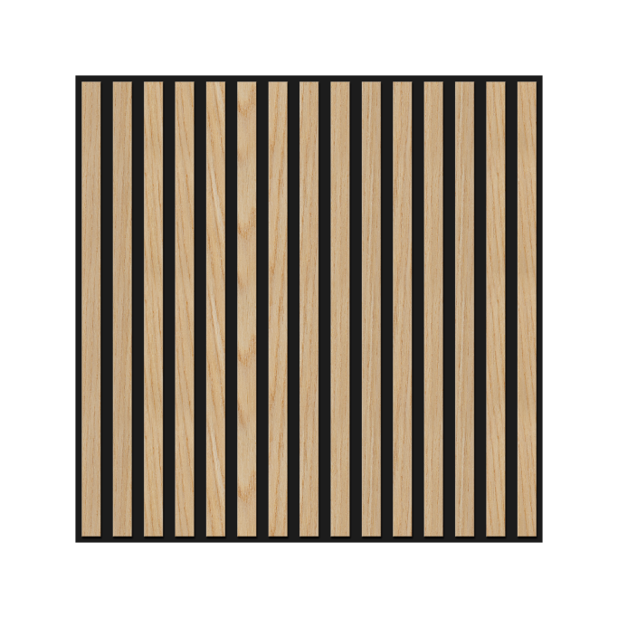 Palillería acústica de formato vertical en roble natural. Listones paralelos de diseño atemporal con base absorbente para un máximo confort.